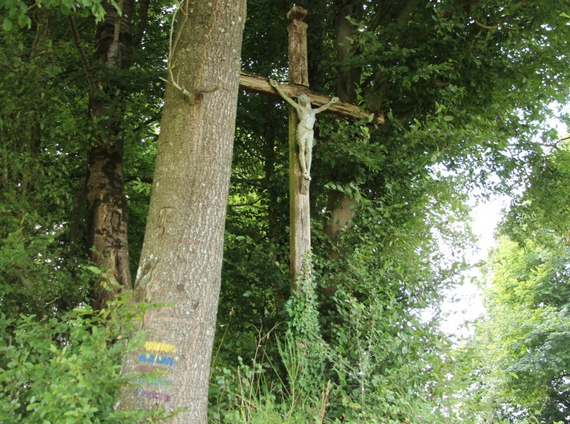La croix a été fixée par des attelles en attendant le séchage du béton