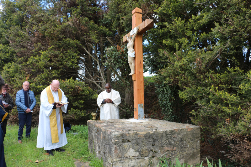 Bénédiction de la nouvelle croix par le père Méziere accompagné du père Kakoma.