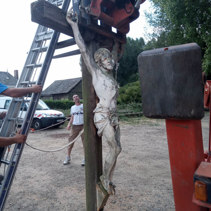 Elle sera refaite en chêne , le socle sera consolidé et le Christ sera sablé et repeint.